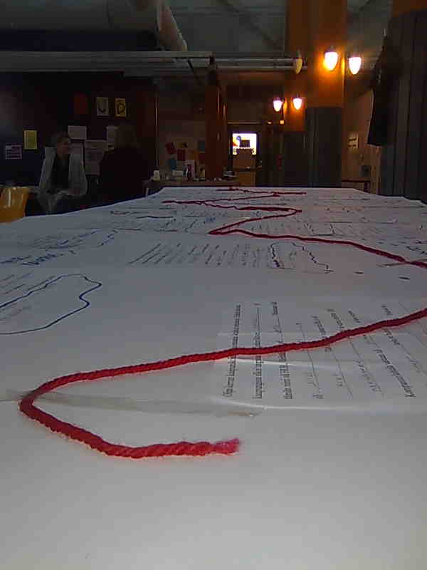 Piirrä ja Siirrä Hub Tarinaksi -työpaja ei kerännyt paikalle suurta joukkoa. Paikalle saapununut pieni joukkomme toimi kuitenkin sitäkin tehokkaammin. Työn ohessa kävimme keskustelua Jyväskylän HUB:ista, sen tavoitteista ja toimintamalleista. Lopputuloksena syntyi tarinamme loppuun ajatus siitä, että ihmiset ovat yhteisön punainen lanka. He myös määräävät sen minne ja millä tavalla HUB tulevaisuudessa suunnistaa.