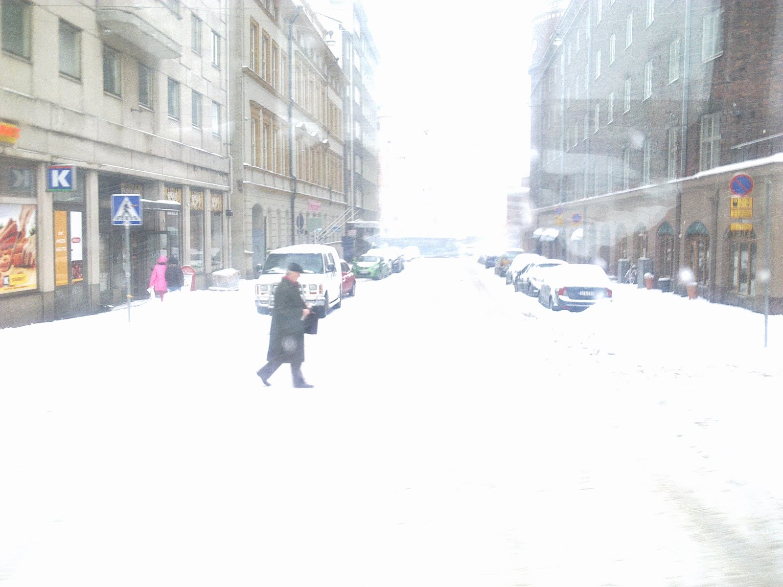 Otin kuvan lumisesta Helsingistä ratikan ikkunasta Kalliosta.
